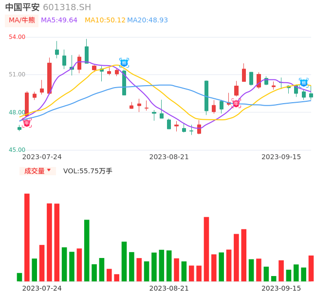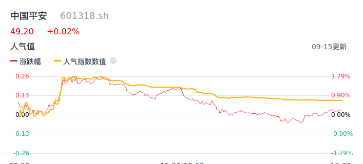 09月15日,中国平安收报49.20,股价涨幅0.02%,成交金额27.61亿元,换手率0.52%。