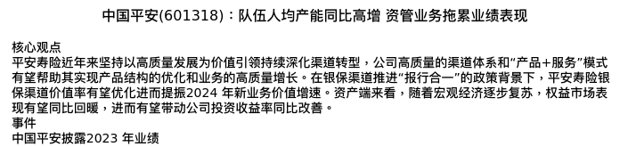 值得注意的是:2024年04月中信建投证券的赵然分析师,首次发布关于中国平安的研究报告,标题为:中国平安(601318):队伍人均产能同比高增 资管业务拖累业绩表现。