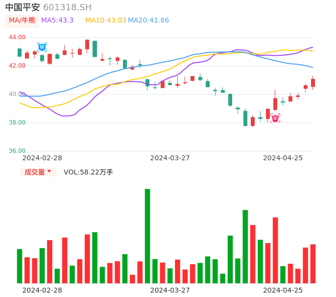 04月25日,中国平安收报41.06,股价涨幅1.13%,成交金额23.79亿元,换手率0.54%。