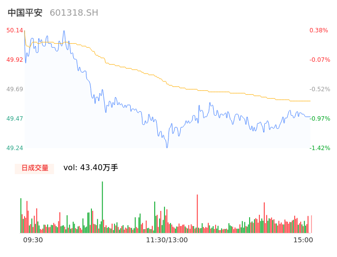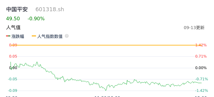 09月13日,中国平安收报49.50,股价涨幅-0.90%,成交金额21.52亿元,换手率0.40%。