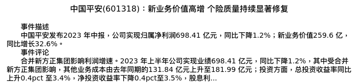 值得注意的是:2023年09月长江证券的吴一凡/谢宇尘分析师,首次发布关于中国平安的研究报告,标题为:中国平安(601318):新业务价值高增 个险质量持续显著修复。