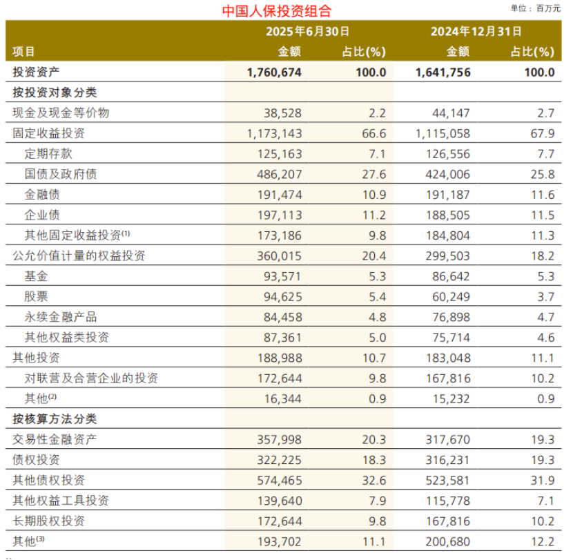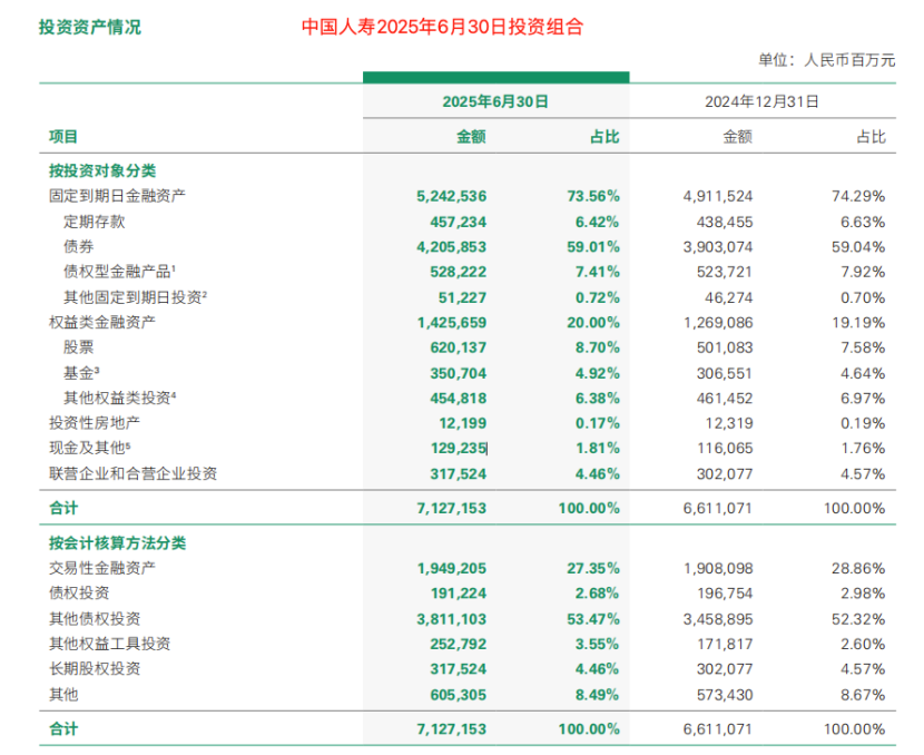 中国人寿配置的债券、定期存款、债权型金融产品等品种配置比例基本保持稳定,股票和基金(不包含货币市场基金)配置比例由2024年底的12.18%上升至13.60%,提升1.42个百分点。