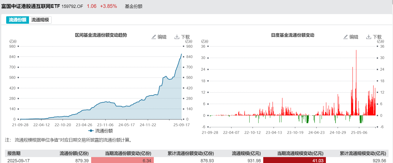 不过,资金近期却在持续流入港股互联网ETF。Wind数据显示,9月17日,富国中证港股通互联网ETF被净申购6.34亿份,是当天被净申购第二多的非货ETF。