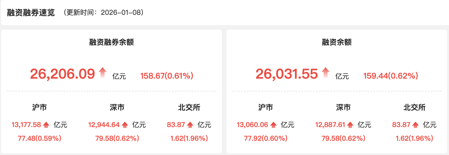 上证报中国证券网讯1月8日,A股两融余额为26206.09亿元,较上一交易日增加158.67亿元,占A股流通市值比例为2.57%。当日两融交易额为3126.04亿元,较上一交易日减少186.28亿元,占A股成交额的11.05%。