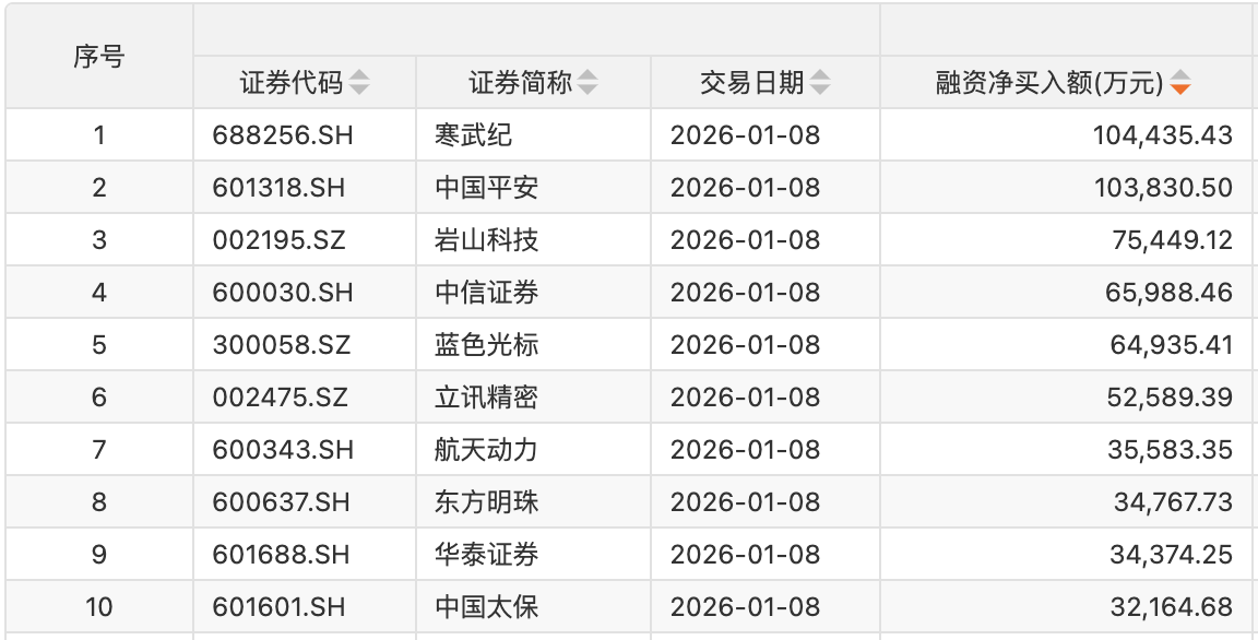 个股方面,74只个股获融资净买入额超1亿元。寒武纪获融资净买入额居首,净买入10.44亿元;融资净买入金额居前的还有中国平安、岩山科技、中信证券、蓝色光标、立讯精密、航天动力、东方明珠、华泰证券、中国太保等。