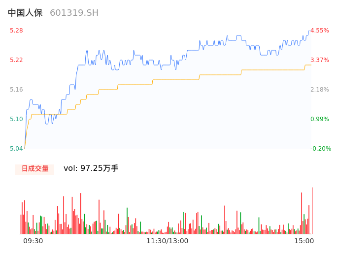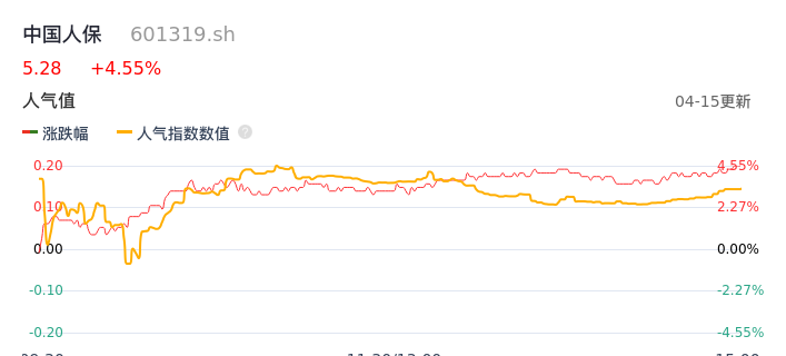 04月15日,中国人保收报5.28,股价涨幅4.55%,成交金额5.06亿元,换手率0.27%。