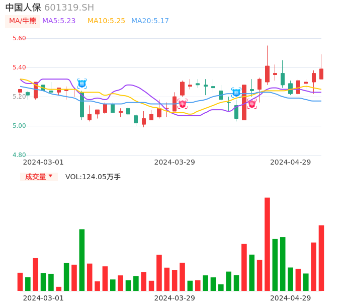 04月29日,中国人保收报5.39,股价涨幅0.56%,成交金额6.72亿元,换手率0.35%。