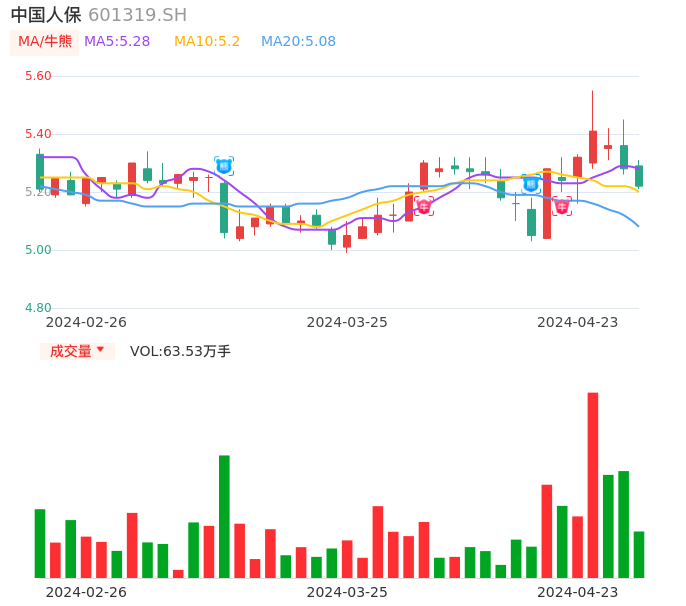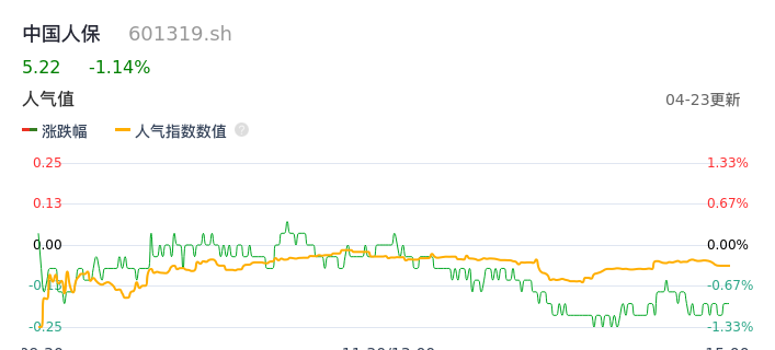 04月23日,中国人保收报5.22,股价涨幅-1.14%,成交金额3.34亿元,换手率0.18%。