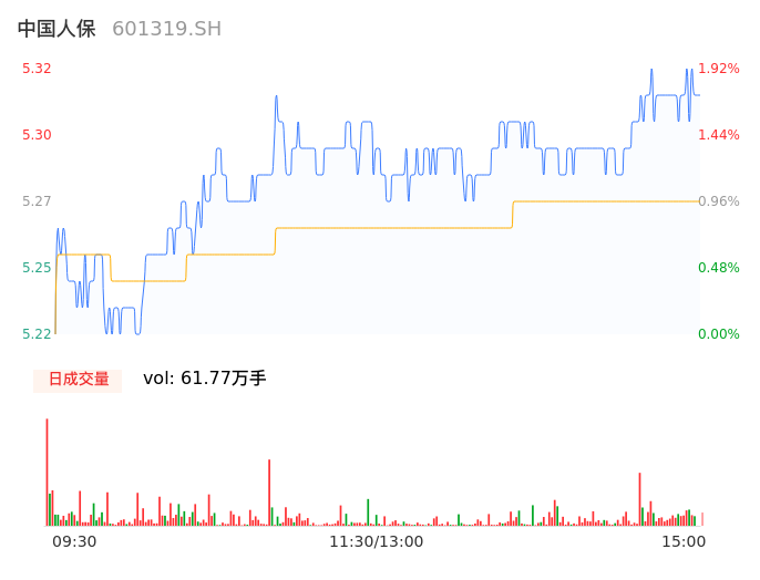 04月24日,中国人保收报5.31,股价涨幅1.72%,成交金额3.26亿元,换手率0.17%。