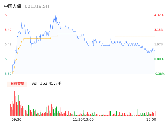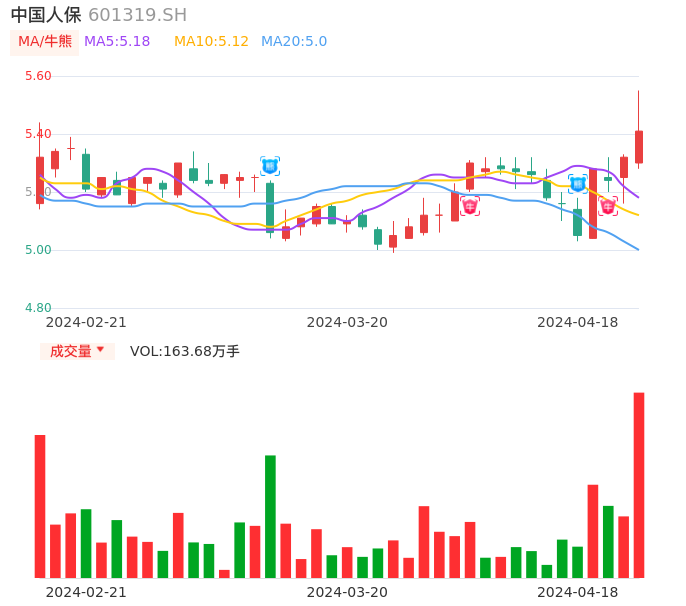 04月18日,中国人保收报5.41,股价涨幅1.69%,成交金额8.93亿元,换手率0.46%。
