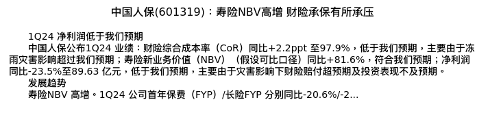 值得注意的是:2024年04月中金公司的毛晴晴/姚泽宇分析师,首次发布关于中国人保的研究报告,标题为:中国人保(601319):寿险NBV高增 财险承保有所承压。