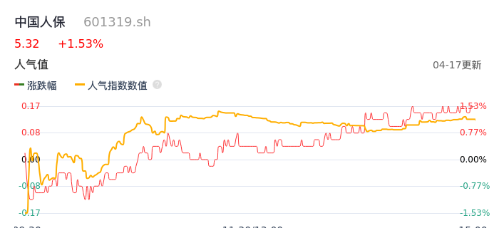 04月17日,中国人保收报5.32,股价涨幅1.53%,成交金额3.91亿元,换手率0.21%。