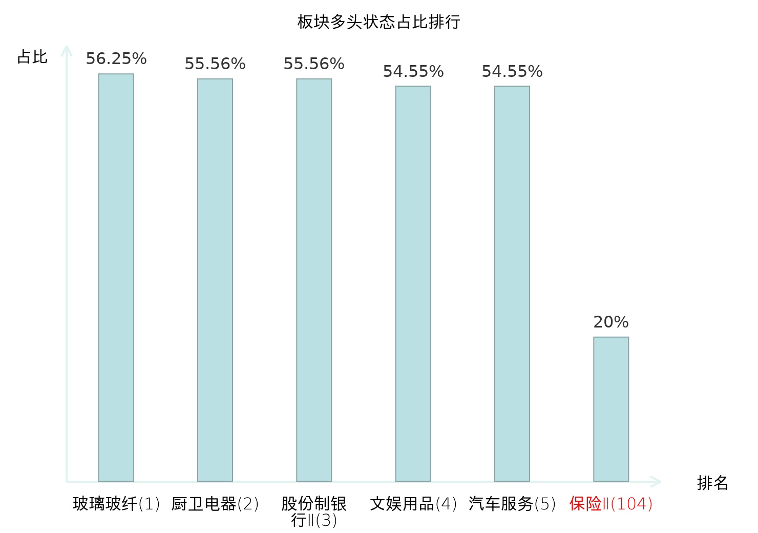 全市场所有行业板块中主力多头状态占比排名中,玻璃玻纤板块位居第一。航天装备Ⅱ板块名次提升最快,较昨日上升84位。
