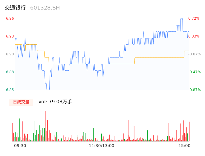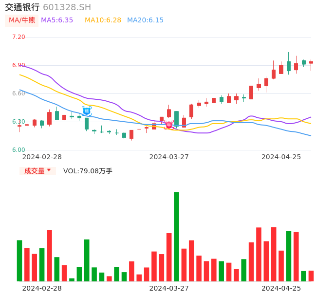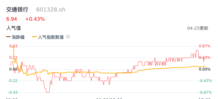 04月25日,交通银行收报6.94,股价涨幅0.43%,成交金额5.46亿元,换手率0.20%。