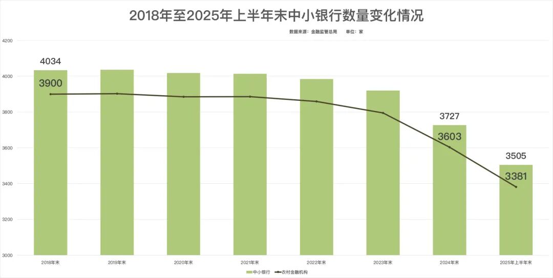 证券时报记者梳理发现,最近两年,中小银行数量有明显减少。根据金融监管总局发布的最新数据,截至今年上半年末,包括村镇银行、农商行、农村信用社、农村资金互助社、农村合作银行、城商行在内的中小银行数量为3505家,较去年末减少222家,较2018年末则减少了529家。