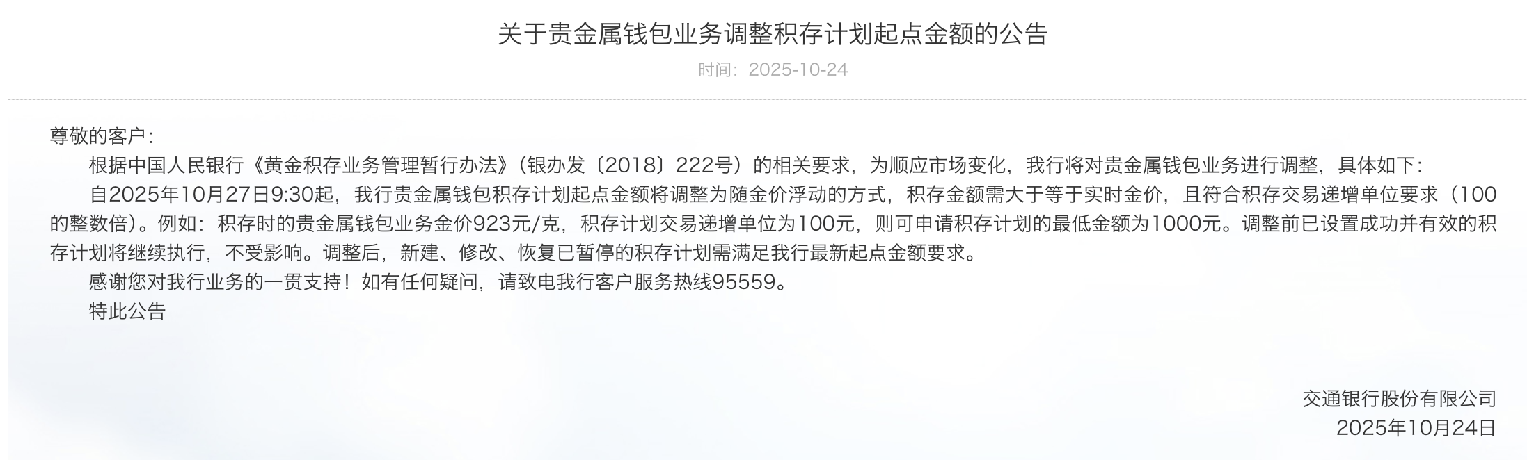 上证报中国证券网讯交通银行近日公告称,为顺应市场变化,交行将对贵金属钱包业务进行调整。自2025年10月27日9:30起,交行贵金属钱包积存计划起点金额将调整为随金价浮动的方式,积存金额需大于等于实时金价,且符合积存交易递增单位要求(100的整数倍)。