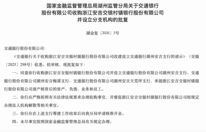 批复称,交行应严格按照有关法律法规要求办理收购事宜,并督促浙江安吉交银村镇银行股份有限公司按规定办理法人机构解散等相关事宜。