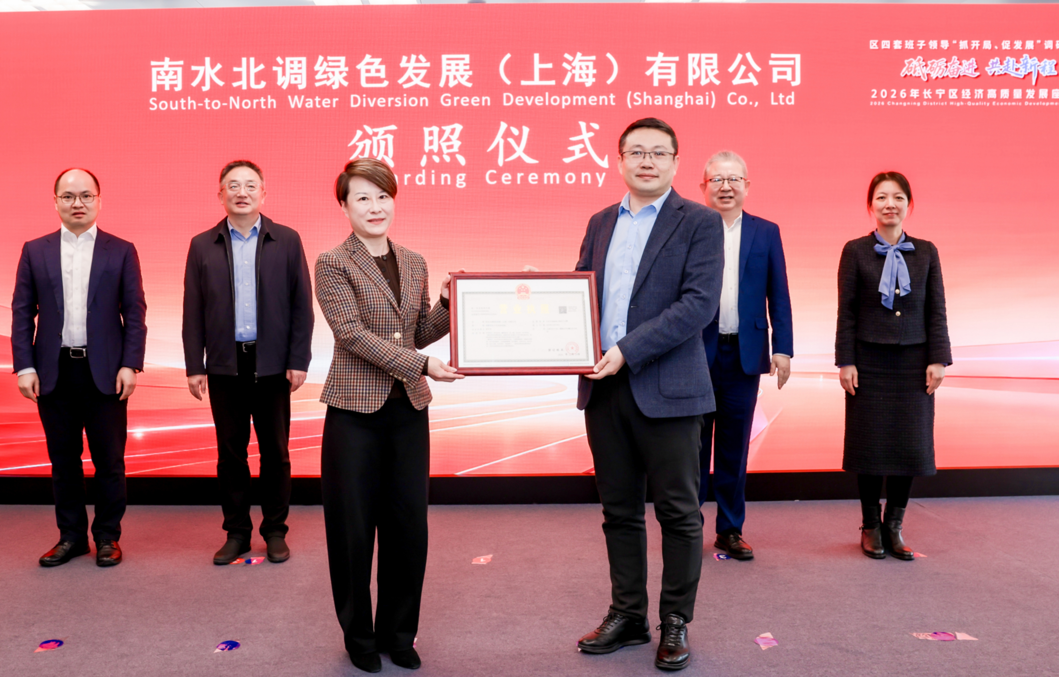 在与会领导与嘉宾的共同见证下,活动现场举行了南水北调绿色发展(上海)有限公司落户颁照仪式,该项目是南水北调集团在沪设立的首家子公司,将打造投融资管理、技术研发创新和高层次人才集聚的一体化平台,总投资超320亿元,是长宁支持央地合作、布局绿色低碳发展的又一重要成果。