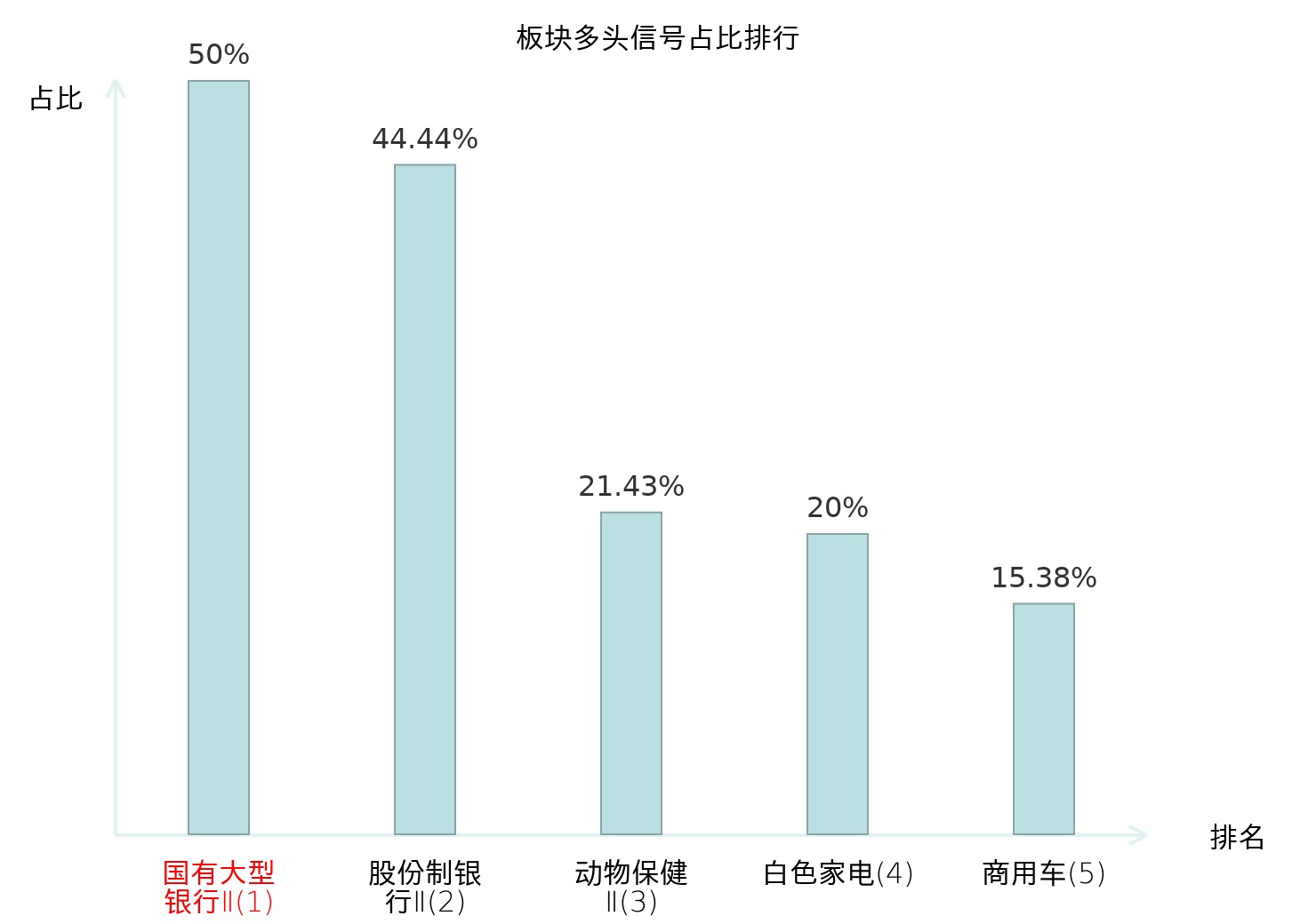 全市场所有行业板块中主力多头信号占比排名中,国有大型银行Ⅱ板块位居第一。房屋建设Ⅱ板块名次提升最快,较昨日上升114位。