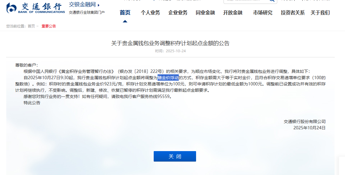 10月24日,交通银行在官网发布公告称,自2025年10月27日9时30分起,该行“贵金属钱包”积存计划的起点金额将不再固定,而是调整为“随金价浮动”的模式。具体而言,客户设置的积存金额需大于等于实时金价,并满足交易递增单位为100元整数倍的要求。