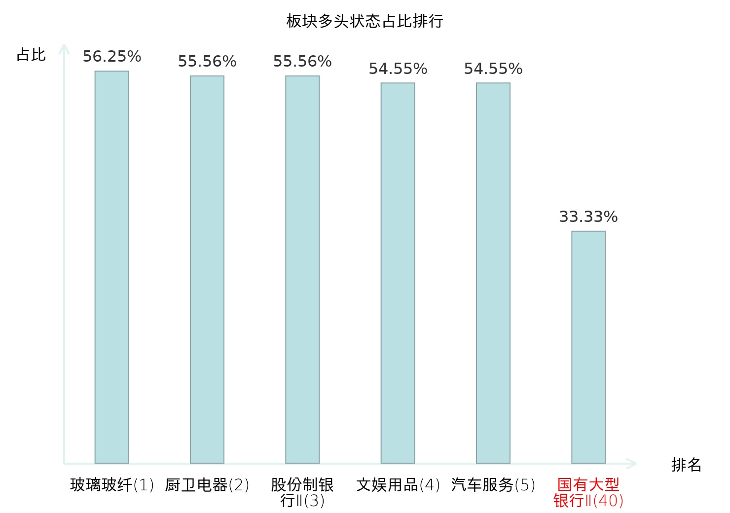 全市场所有行业板块中主力多头状态占比排名中,玻璃玻纤板块位居第一。航天装备Ⅱ板块名次提升最快,较昨日上升84位。