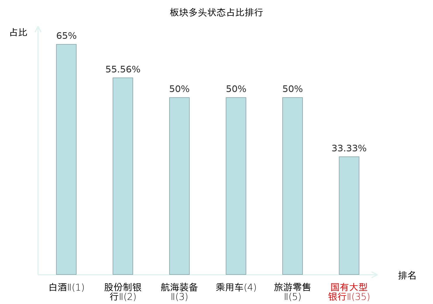全市场所有行业板块中主力多头状态占比排名中,白酒Ⅱ板块位居第一。其他家电Ⅱ板块名次提升最快,较昨日上升93位。