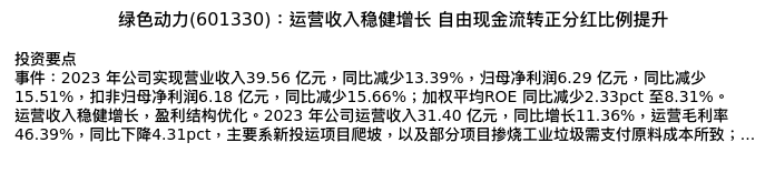 值得注意的是:2024年04月东吴证券的袁理/陈孜文分析师,首次发布关于绿色动力的研究报告,标题为:绿色动力(601330):运营收入稳健增长 自由现金流转正分红比例提升。