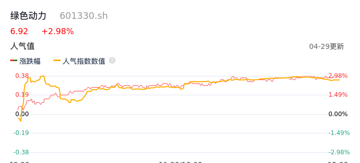 04月29日,绿色动力收报6.92,股价涨幅2.98%,成交金额3975.89万元,换手率0.59%。