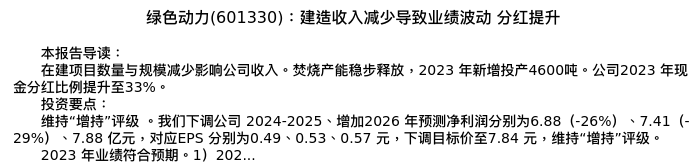 值得注意的是:2024年04月国泰君安的徐强/邵潇/于歆分析师,首次发布关于绿色动力的研究报告,标题为:绿色动力(601330):建造收入减少导致业绩波动 分红提升。
