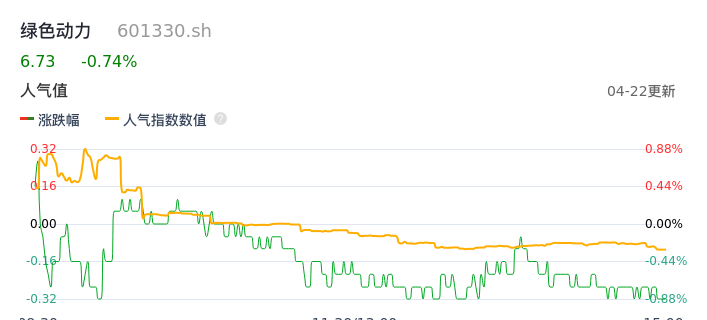 04月22日,绿色动力收报6.73,股价涨幅-0.74%,成交金额2319.72万元,换手率0.35%。