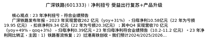 值得注意的是:2024年04月华泰证券的沈晓峰/林霞颖分析师,首次发布关于广深铁路的研究报告,标题为:广深铁路(601333):净利扭亏 受益出行复苏+产品升级。