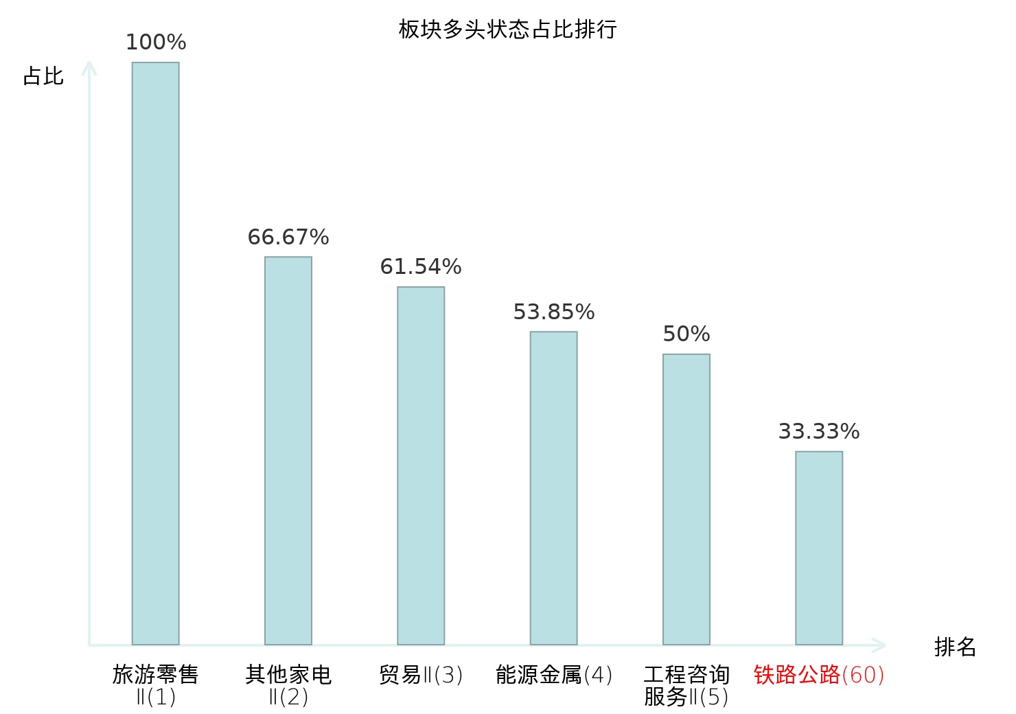 全市场所有行业板块中主力多头状态占比排名中,旅游零售Ⅱ板块位居第一。冶钢原料板块名次提升最快,较昨日上升37位。