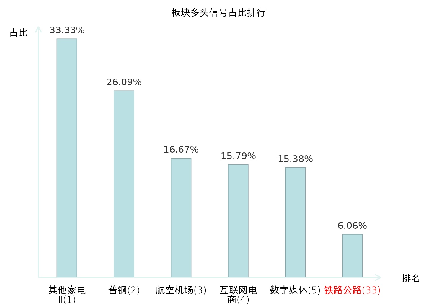 全市场所有行业板块中主力多头信号占比排名中,其他家电Ⅱ板块位居第一。其他家电Ⅱ板块名次提升最快,较昨日上升129位。