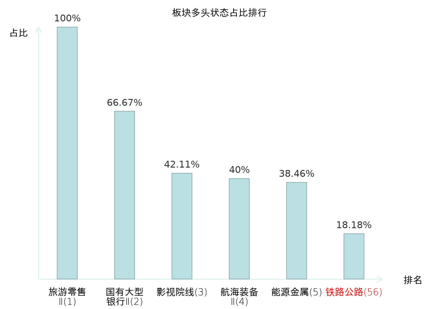 全市场所有行业板块中主力多头状态占比排名中,旅游零售Ⅱ板块位居第一。林业Ⅱ板块名次提升最快,较昨日上升102位。