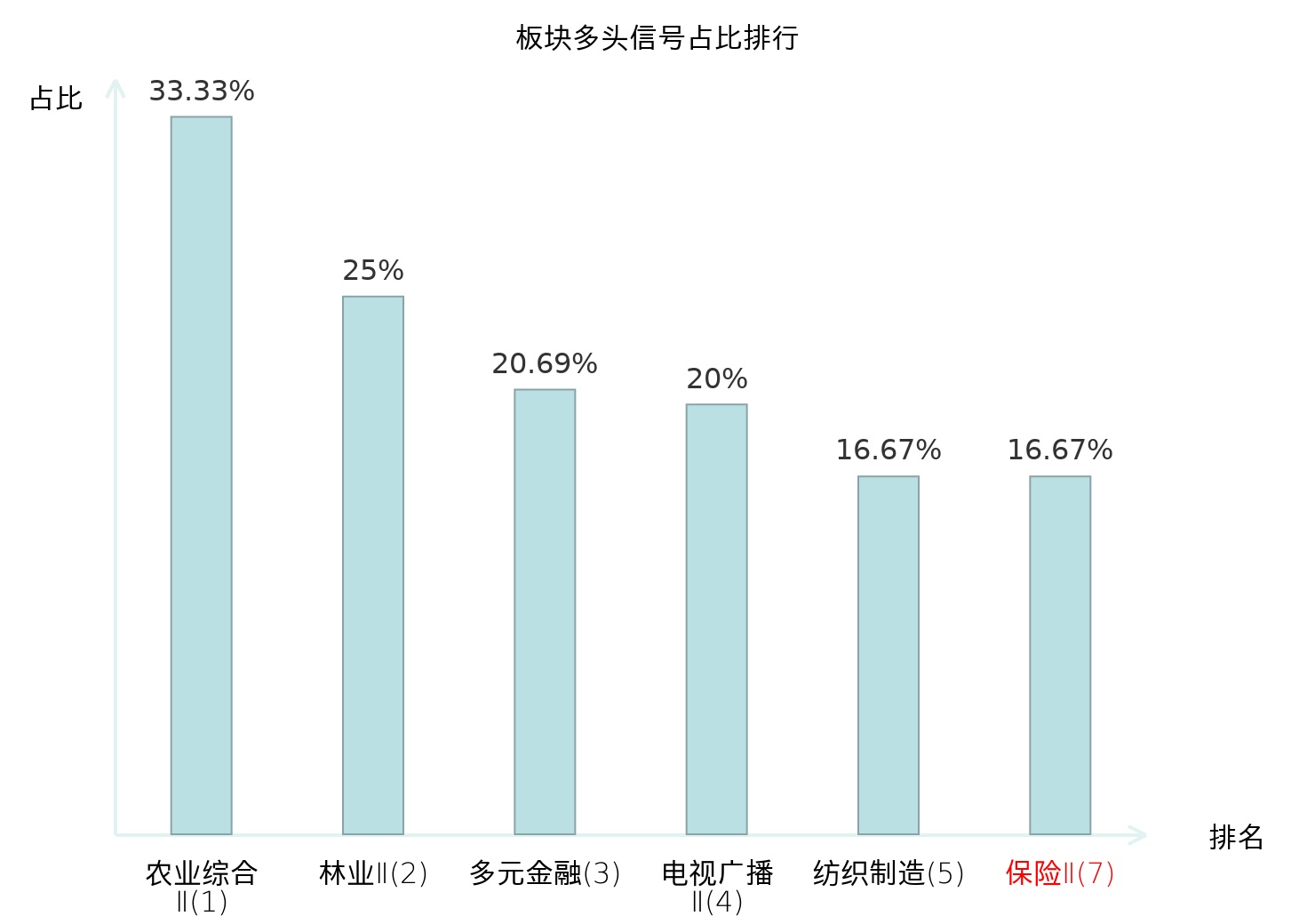 全市场所有行业板块中主力多头信号占比排名中,农业综合Ⅱ板块位居第一。农业综合Ⅱ板块名次提升最快,较昨日上升127位。