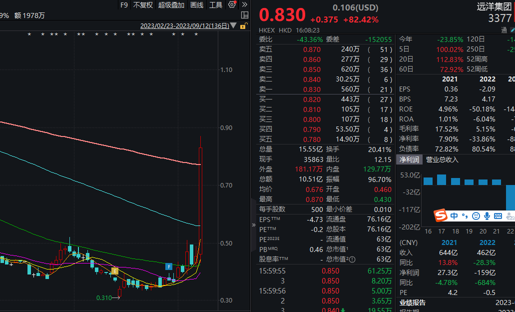 港股市场方面,内房股总体再度反弹,多只内房股涨幅惊人,其中远洋集团收盘暴涨超过80%。