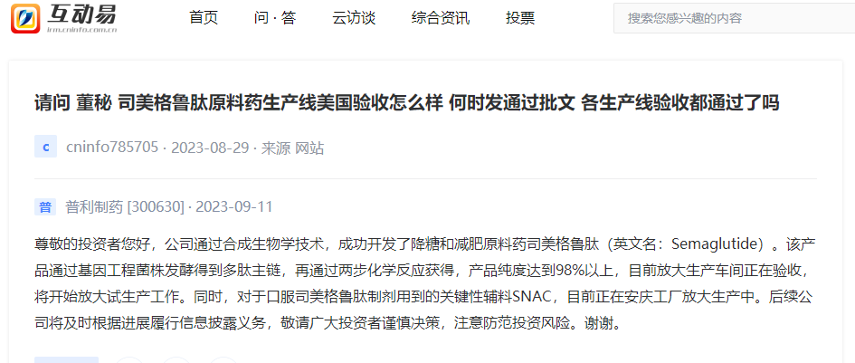 普利制药近日在互动易平台表示,公司通过合成生物学技术,成功开发了降糖和减肥原料药司美格鲁肽。该产品通过基因工程菌株发酵得到多肽主链,再通过两步化学反应获得,产品纯度达到98%以上,目前放大生产车间正在验收,将开始放大试生产工作。同时,对于口服司美格鲁肽制剂用到的关键性辅料SNAC,目前正在安庆工厂放大生产中。