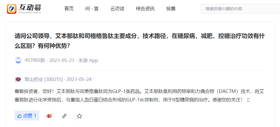 常山药业今年5月份曾经在互动易表示,艾本那肽与司美格鲁肽同为GLP-1类药品。艾本那肽是利用药物亲和力偶合物(DACTM)技术,将艾塞那肽进行化学修饰后,与重组人血白蛋白结合形成的GLP-1长效制剂,用于II型糖尿病的治疗。