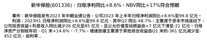 值得注意的是:2023年09月财通证券的夏昌盛/舒思勤分析师,首次发布关于新华保险的研究报告,标题为:新华保险(601336):归母净利同比+8.6%、NBV同比+17%符合预期。