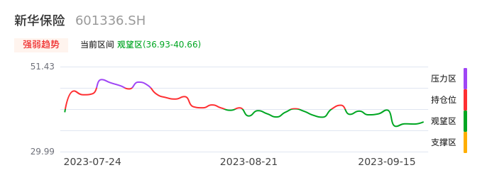 我们来看一下该股的九方特色指标强弱趋势的情况:新华保险自09月05日从持仓区下穿到观望区。股价近期持续下跌后,短期出现止跌迹象。后续重点关注能否再次站上多空分界点:40.66元。如未能有效突破则可能进入新一轮空头行情。