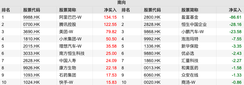 大幅净流入:阿里巴巴-W(09988.HK)134.15亿港元;腾讯控股(00700.HK)122.55亿港元;美团-W(03690.HK)79.82亿港元;小米集团-W(01810.HK)50.50亿港元;理想汽车-W(02015.HK)35.58亿港元。