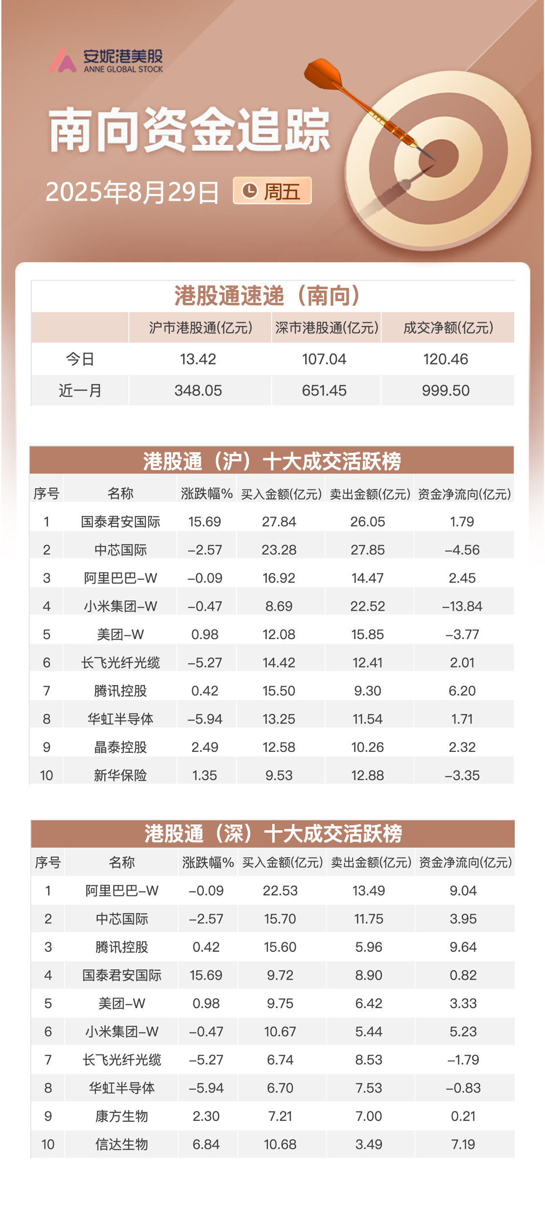 今日,南向资金净流入约120.46亿港元,其中沪港股通净流入约13.42亿港元,深港股通净流入约107.04亿港元。
