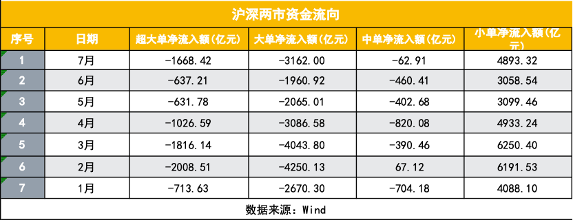 以小单(挂单额小于4万)衡量的A股散户资金净流入规模数据显示,今年1-7月A股小单资金均为净流入状态。