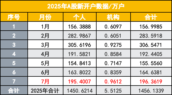 新开户数量的变化在一定程度上反映了股民的入场意愿,进而反映入金情况。2025年A股新开户数据显示,1-7月合计开户1456万户,同比增长37%,其中个人开户1450万户,机构开户5.5万户。从各月数据来看,3月开户数量最多,达到307万户,2月次之,为284万户,7月为第三,达196万,同比增长71%。这一数据与资金流入的高峰月份基本一致,表明新增投资者的不断入场为市场带来了持续的新鲜血液。