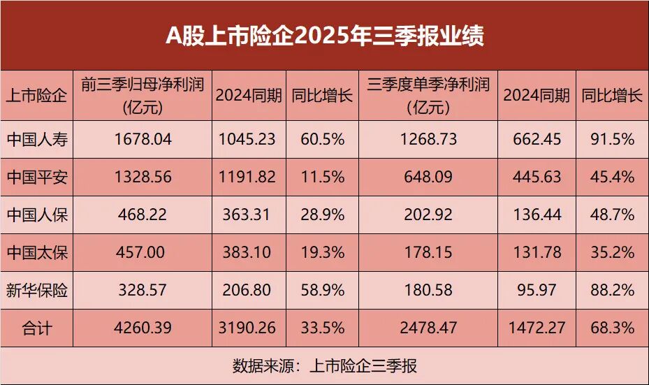 2025年前三季度,中国人寿、中国平安、中国人保、中国太保、新华保险等五大A股上市险企合计实现归母净利润4260.39亿元,较去年同期增加超千亿元,增幅33.5%,继去年同期创下历史新高后再上新台阶。