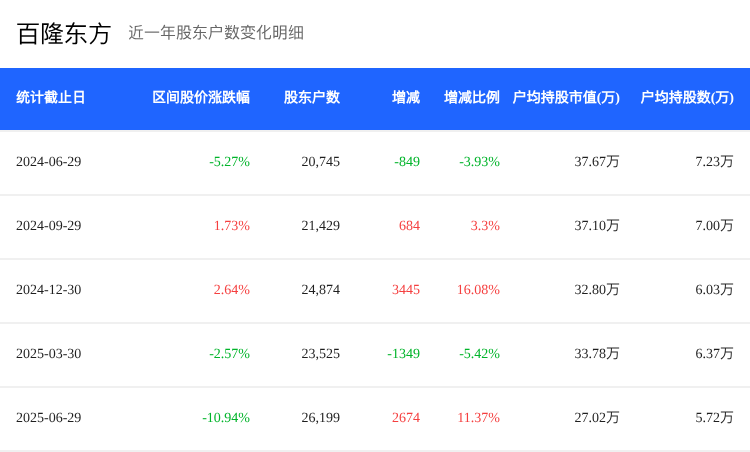 截至2025年6月30日,百隆东方(601339)的股东户数增至2.62万户,环比增长了11.37%。与此同时,户均持股数量环比下降10.21%,户均持股市值降至27.02万元,环比下降了20.03%。这表明,尽管股东人数增加,但每位股东的平均持股量和市值均有所减少。