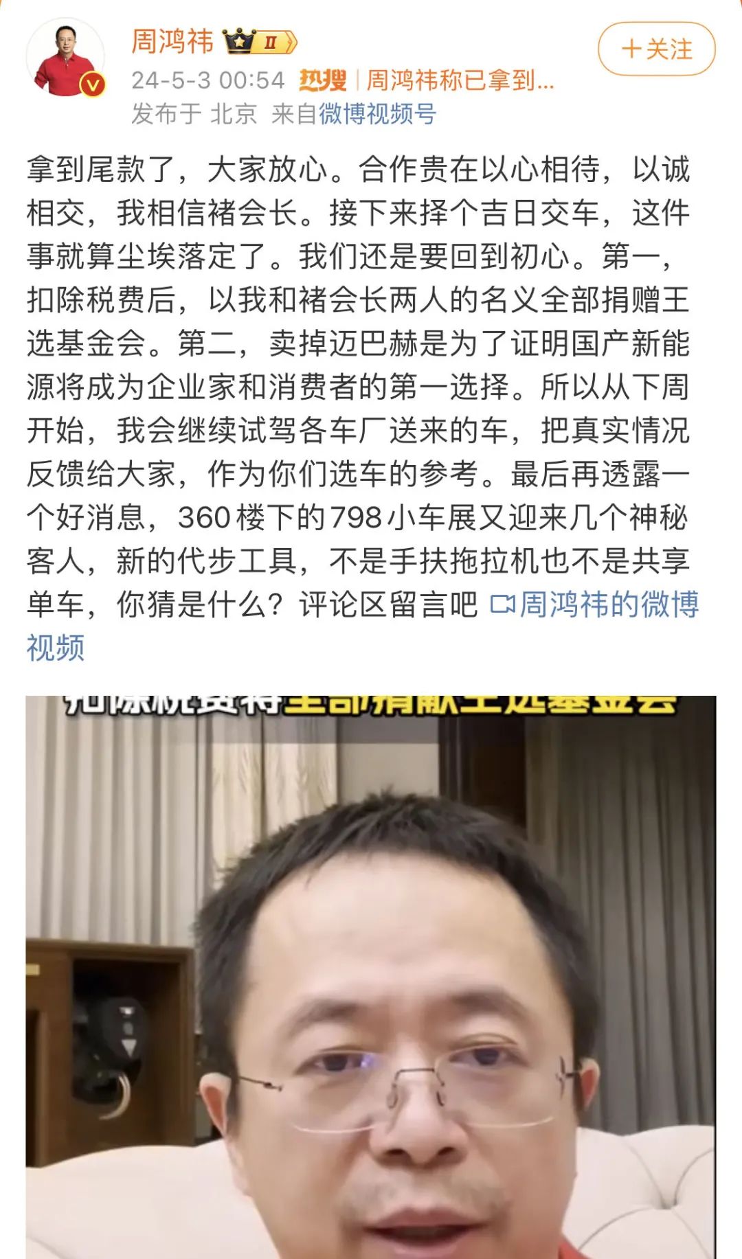 周鸿祎凌晨发视频表示,迈巴赫尾款已经拿到了,扣除税费将全部捐献给王选基金会。他表示,将择日举办交接仪式。