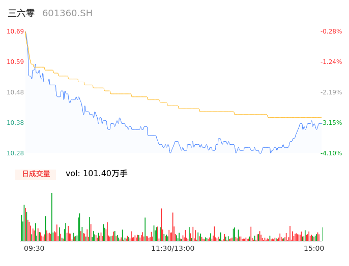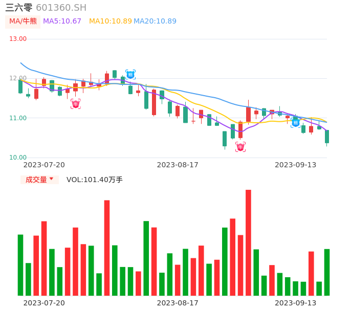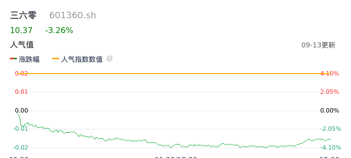 09月13日,三六零收报10.37,股价涨幅-3.26%,成交金额10.54亿元,换手率1.42%。
