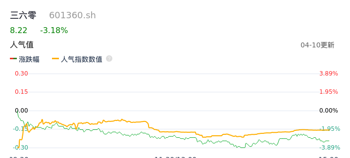 04月10日,三六零收报8.22,股价涨幅-3.18%,成交金额5.42亿元,换手率0.92%。