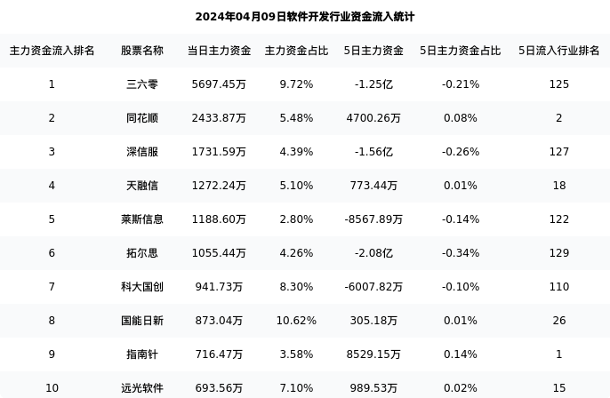 下表为今日行业内流入前10股票的信息
